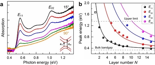 90°。插圖為光學躍遷示意圖。(b) 黑磷的能帶結構隨著層數的演化規律。
