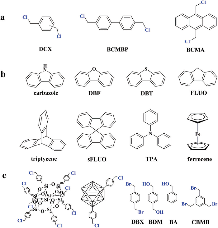 在實驗中使用三種雙(氯甲基)芳族結(jié)構(gòu)單元,包括二氯甲基苯乙烯(DCX),(4, 4’-二氯甲基-1, 1’-聯(lián)苯)BCMBP和二氯甲基蒽(BCMA)(圖3a),以獲得一系列超交聯(lián)聚合物。除了自縮合反應以外,二氯甲基芳族單體也可以充當外部交聯(lián)劑以連接其他物質(zhì),典型共聚單體的分子結(jié)構(gòu)如圖3b。