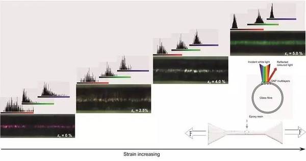 一般情況下,涂層為紅色,產生變形時會略顯黃色,當開裂達到微米級別時則會變為綠色。這種變色能力來自于包覆著玻璃纖維的半透明平行層狀石墨烯薄片的精準初始定向性質。在壓力下,這些層結構壓縮變扁,從而改變了反射光的干涉和顏色。