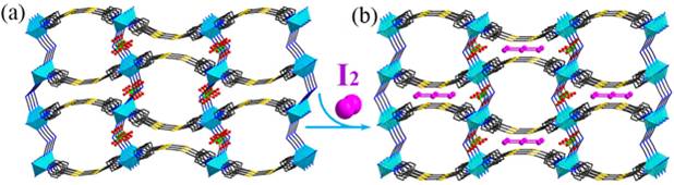 圖1 (a) 2的三維網狀結構; (b) 摻碘后2@I2的三維網狀結構