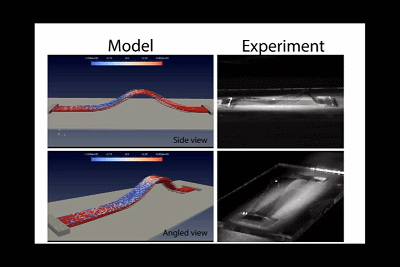 為了進一步研究薄膜產生波動及決定波動速度、方向的機理,作者采用有限元彈性動力學分析研究了薄膜在光照下的波動情況,模擬結果表明光誘導的振蕩、自遮蔽效應和力學限制足以產生實驗中觀察到的連續波動。