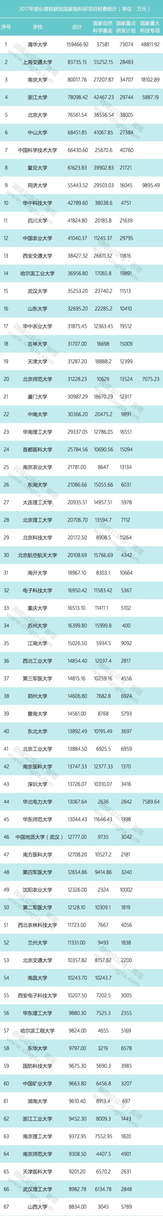 根據高校獲批三大國家級科研項目的數據,能對高校2017年獲批科研經費有個大致的了解。整理了目前已獲批三類國家級科研項目總經費1000萬以上的大學數據,供大家參考。