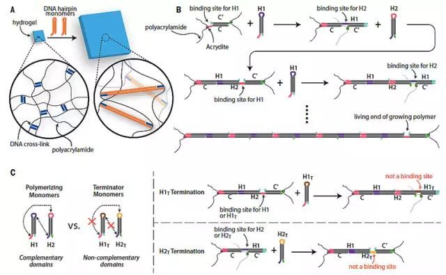 DNA雜交反應的基礎是兩條單鏈DNA存在互補堿基序列,而互補堿基之間配對使得兩條單鏈DNA相互結合成雙鏈。將DNA雜交反應用于制備交聯水凝膠結構還需要先解決DNA水凝膠的溶脹率問題,一般報道的DNA水凝膠雜交反應的溶脹率只有10-15%,這還不足以實現宏觀的材料形變。為了解決這一問題,研究者巧妙地設計了DNA雜交級聯反應,通過加入兩種帶有互補序列的“可聚合發夾DNA”,原水凝膠中DNA交聯鏈被打開并連續發生DNA雜交反應(下圖A/B),從而延長了水凝膠中DNA交聯鏈的長度,提升凝膠的溶脹度。另外,這種DNA雜交級聯反應還可以通過加入兩種帶有非互補序列的“終止發夾DNA”來終止(下圖C),從而控制水凝膠的溶脹程度。