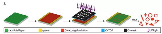 研究者希望使用電子工業中常見的光刻法(photolithography)來制備不同形狀的DNA響應水凝膠。不過DNA水凝膠本身模量低,較易粘附在基底表面,而且DNA在紫外光下易被破壞。為了解決上述問題,研究者們通過優化進光量來減少對DNA的損傷。此外他們設計了一種三層結構,在基底和水凝膠之間增加了犧牲層,在完成賦形后通過溶解犧牲層使得不同形狀的水凝膠脫離。