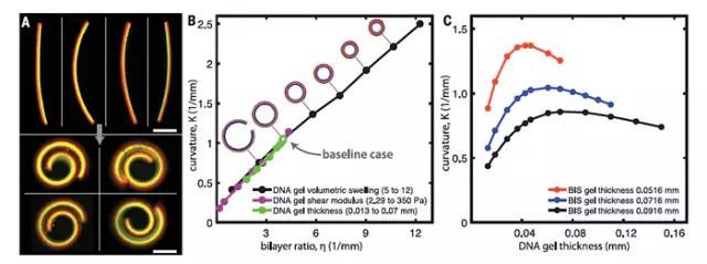 為了更好地利用這種DNA響應水凝膠設計復雜結構形變材料,研究者制備了雙層結構的水凝膠作為模型,進行形變力學研究。DNA響應水凝膠的雙層比(bilayer ratio)由厚度、模量、溶脹度決定,而這一參數能顯著影響其響應時的曲率變化。在這些因素中,形變曲率對于溶脹比最為敏感。非常重要的一點是,雙層凝膠的曲率變化與雙層比幾乎呈線性關系,這使精確調控凝膠形變成為可能。