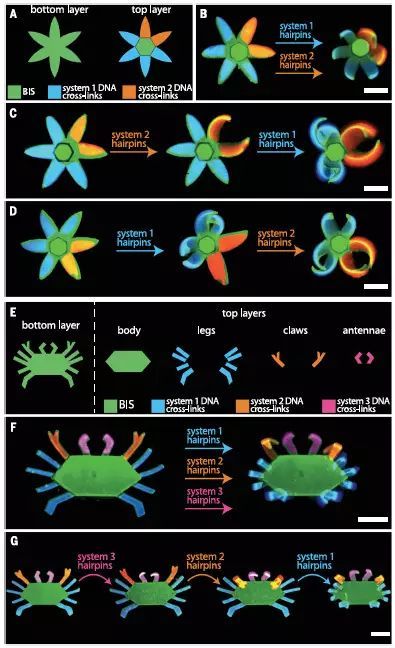 材料設計、制備工藝、理論研究,一切基礎都已齊備之后,研究者們開始了炫酷的應用展示。通過使用不同的DNA分子系統,他們精細地控制著水凝膠“花朵”和“螃蟹”的不同位置發生形變,看上去“花瓣”似乎在隨風舞動開開合合,而“螃蟹”則是左顧右盼張牙舞爪。