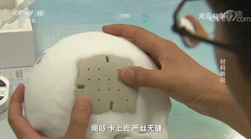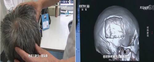 手術團隊考慮到老唐有腦出血病史,以后很難避免不做頭部檢查,如果用金屬鈦板修補,可能在做磁共振時候出現射頻效應,它會局部發燒,或者把周圍的組織灼傷。經過和西安交通大學材料系老師的合作,他們找到了一種抗壓、抗砸、抗高溫的新型材料,叫聚醚醚酮材料。聚醚醚酮材料做成的顱骨修補可以把病人原始的曲率完全重現,包括臉部,顴弓部都可以達到完美的嚴絲合縫。