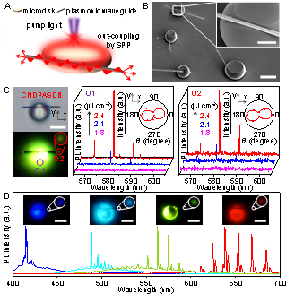 進一步,為了解決亞波長相干光源的波長調制問題,研究人員設計了一種有機微盤/銀納米線復合結構(圖2)。采用毛細作用力輔助的液相組裝方法將銀納米線嵌入在有機微盤的邊緣,摻雜激光染料的微盤在光學泵浦下作為高質量的回音壁模式激光器,而嵌入的銀線可通過SPP將激光信號在亞波長尺度下進行傳輸。利用聚合物微盤優(yōu)異的材料兼容性,將具有不同光學增益范圍的染料添加到微盤中,實現(xiàn)了可波長覆蓋整個可見范圍的微型激光。這種復合結構結合了有機激光材料和銀納米線的優(yōu)勢,對納米光子學功能器件的研究提供了一種新的研究思路。相關研究成果發(fā)表于J. Am. Chem. Soc. 2017, 139, 11329-11332。