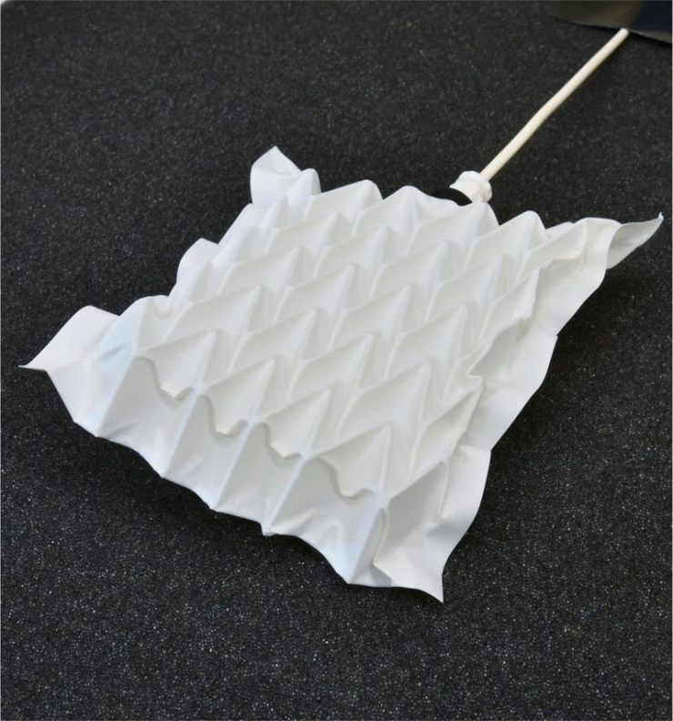 他們研發的人工肌肉由一層密封的“皮膚”材料包裹著“骨骼”構成,里面填充空氣或水等流體,其中的“骨骼”受折紙藝術啟發利用折疊結構設計而成。