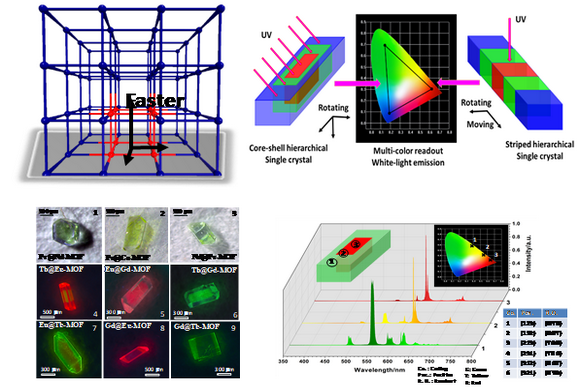 近年來,基于超分子化學的組裝理念,構筑具有有序高級結構和復雜功能特性的新物質、新材料、新器件的研究引起了廣泛的關注,并在光、電、磁、吸附、催化等諸多領域帶來一系列突破性和開創性的進展。其中,利用“自下而上”的構筑策略,在有序配位空間內,合理預設、配置和優化金屬與配體的多中心結構與光功能基元,組裝具有多組分、多層次、多功能特性的單晶相金屬-有機配位光學材料,既可體現配位超分子作為結構組裝平臺的獨特空間集成與匹配協同效應,又可帶來不同于各簡單功能基元的可控復合、疊加與可調變光學性能,從而為獲得新型光調控、光響應、光轉換型光功能復合材料,并在全色域發光、照明、顯示、傳感、防偽等諸多領域實現微型芯片化、器件化提供了新的途徑。