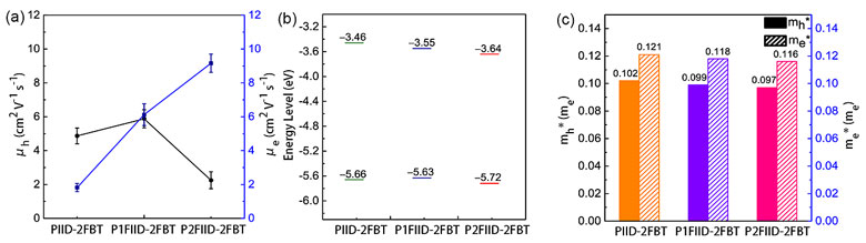 圖2.(a)聚合物FET的空穴和電子遷移率;(b)聚合物的HOMO和LUMO能級;(c)理論計算得出聚合物的空穴和電子有效質量,me表示一個電子的質量。
