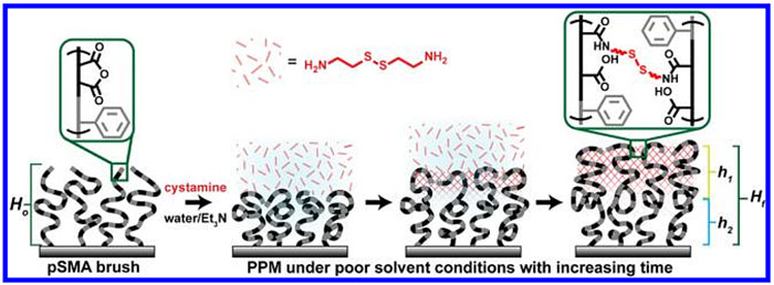 不良溶劑環(huán)境下胱胺改性pSMA聚合物刷反應(yīng)示意圖。圖片來(lái)源:Macromolecules