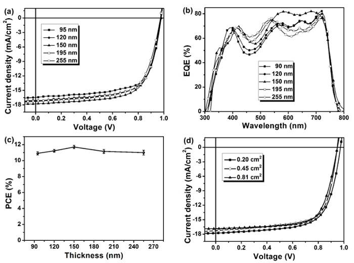 圖2.(a)不同活性層膜厚時的電流-電壓曲線;(b)外量子效率曲線;(c)器件效率與活性層膜厚的關系;(d)不同器件面積時的電流-電壓曲線。