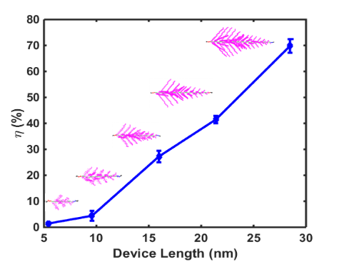 為了理解背后的機理,他們計算了熱整流率與聚合物分子長度的關系。結果發現,隨著聚合物分子長度的增大,熱整流率增加最終可以高達70%(圖二)。