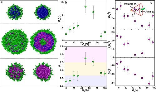 (a)通過PISA制備得到的親水性PDMA嵌段(綠色)與由BzMA(藍色)和SMA(粉紅色)組成的疏水性嵌段組裝形成的嵌段共聚物的模擬形貌的圖像,濃度SMA:CS情況如下:0(頂部),0.5(中間),1.0(底部)。圖中沒有顯示溶劑情況;