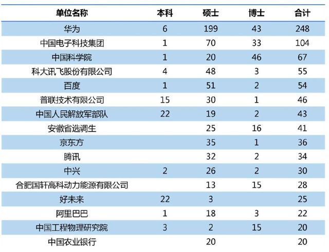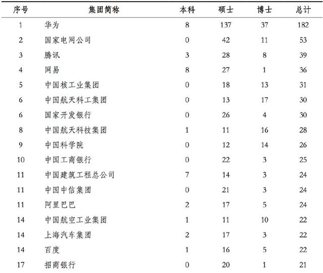 不過,與2016年一樣,今年華為依然成為接受一流大學建設高校畢業生最多的企業,一流大學建設高校進入華為畢業生人數較多的高校(超200人),包括:浙江大學(446人)、西安交通大學(365人)、東南大學(358人)、哈爾濱工業大學(269人)、南京大學(256人)上海交通大學(237人)和中國科學技術大學(248人)和武漢大學(223人)。