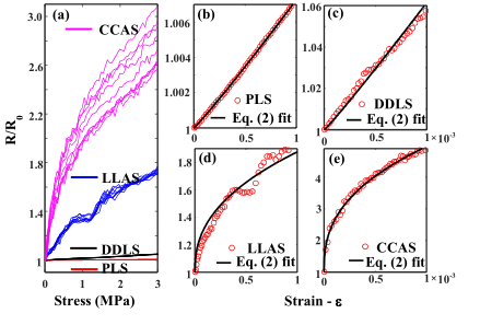 圖1.3 a)不同接觸結構傳感器相對電阻隨應變的變化。b-e)不同接觸結構傳感器PLS(b),DDLS(c),LLAS(d)和CCAS(e)一個循環的相對電阻隨應變的變化(點線),以及對應的用公式(1.2)模型的擬合結果(實線),擬合參數分別為m = 0.53,εc = 0.10;m = 0.53,εc= 0.014;m = 0.21,εc = 0.0014;m = 0.19,εc =0.000029。