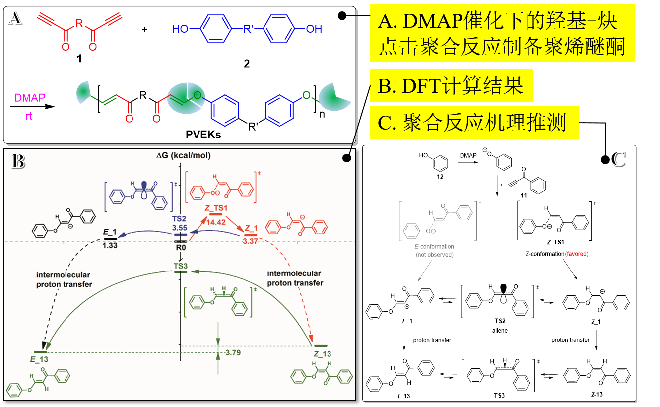 在前期工作中,研究團(tuán)隊(duì)發(fā)現(xiàn)與羰基直接相連的炔具有更高的反應(yīng)活性,大大有利于無金屬催化的聚合反應(yīng),于是,按照文獻(xiàn)方法首先合成了炔酮類單體1。其次,使用雙官能度炔酮單體1和購買來的雙酚類單體2進(jìn)行了聚合嘗試(圖A),通過改變反應(yīng)時(shí)間、反應(yīng)溶劑、單體和催化劑的濃度以及反應(yīng)溫度,最終篩選出在空氣氛圍下在THF溶劑,于室溫下反應(yīng)4小時(shí),便能夠獲得高分子量(35,200)和窄分子量分布(1.72)的聚合物,反應(yīng)產(chǎn)率高達(dá)99%。而且,這些聚合物均可溶于常用的有機(jī)溶劑,例如THF、氯仿、二氯甲烷、DMSO等。接下來,紅外譜圖、1H NMR的特征氫位移和耦合常數(shù)的計(jì)算結(jié)果,都有利地證明只生成了反馬氏加成后的反式異構(gòu)體,說明該反應(yīng)具有優(yōu)異的區(qū)域選擇性和立體選擇性。最后,通過改變不同結(jié)構(gòu)的單體在最優(yōu)條件下進(jìn)行反應(yīng),都得到了很好的結(jié)果,此反應(yīng)的普適性也得到了證實(shí)。同時(shí),團(tuán)隊(duì)使用DFT計(jì)算(圖B)和實(shí)驗(yàn)結(jié)果相結(jié)合的方法對(duì)該聚合反應(yīng)的機(jī)理進(jìn)行了研究,最終推測出該羥基-炔聚合反應(yīng)機(jī)理如圖C所示。