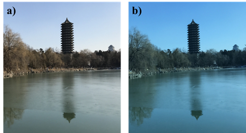 北大博雅塔照片(a和b分別為相機(jī)鏡頭被半透明太陽能電池遮擋前后)