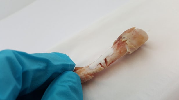瑞典皇家理工學院和卡羅林斯卡學院的科學家創建了不會引起排斥的貼片。它大約需要五分鐘就能完成應用。首先,將酸性自蝕刻底漆直接施用于骨骼,將其表面去掉以暴露其膠原纖維。接下來,施加粘合劑樹脂。它含有與暴露膠原蛋白糾纏在一起的微小纖維。最后,在一個被稱為巰基 - 烯偶聯的過程中,樹脂通過暴露于LED光線而被硬化 - 就像牙醫在填充空洞時所做的一樣。