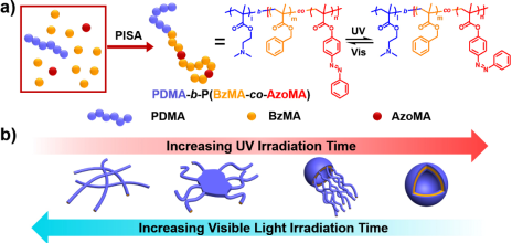 袁金穎教授課題組運用聚合誘導自組裝技術,制備了光響應的蠕蟲狀膠束,并研究了光調控的蠕蟲狀膠束-囊泡的動態形貌轉變過程。他們以聚甲基丙烯酸二甲氨基乙酯(PDMA)作為大分子鏈轉移劑,在乙醇中引發甲基丙烯酸芐酯(BzMA)和甲基丙烯酸偶氮苯酯(AzoMA)的無規RAFT分散共聚,將偶氮苯基團引入到疏溶劑鏈段中,制備得到光響應的蠕蟲狀膠束。
