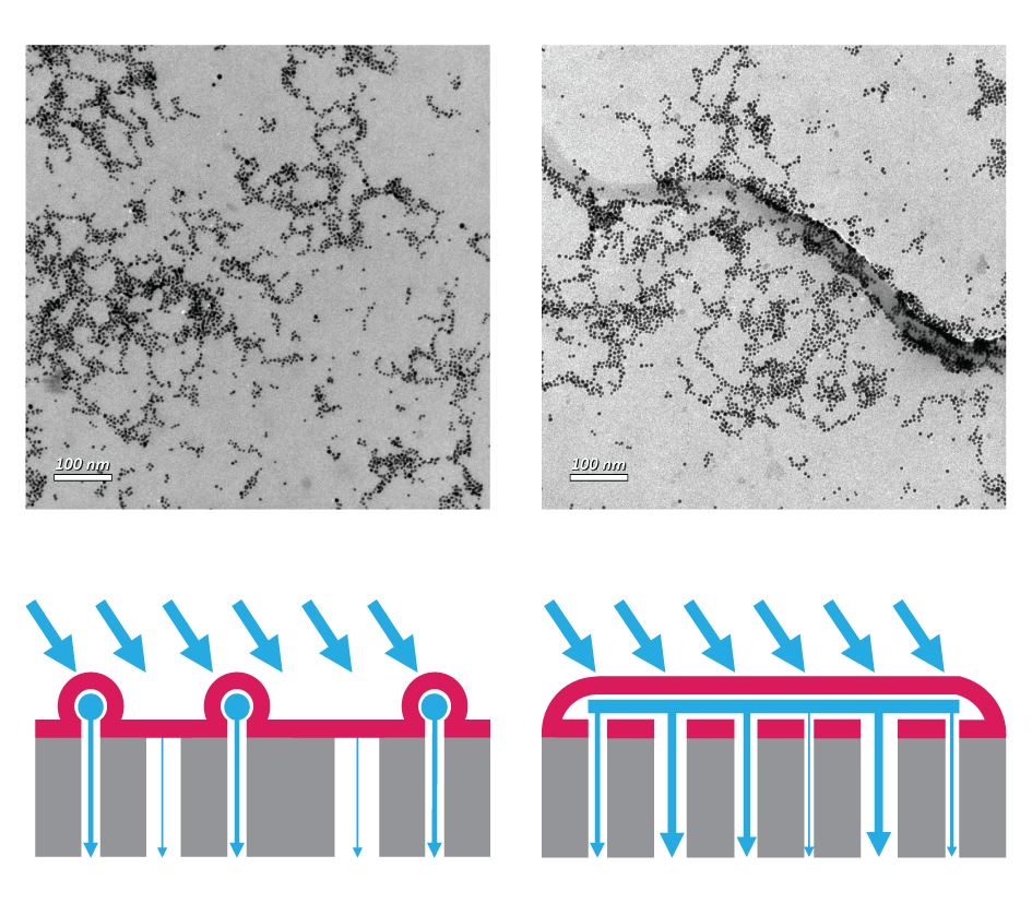上圖是用金納米顆粒驗證圖靈結構聚酰胺膜上水滲透位點空間分布的透射電鏡圖;下圖是水傳遞通過圖靈結構聚酰胺膜的示意圖。