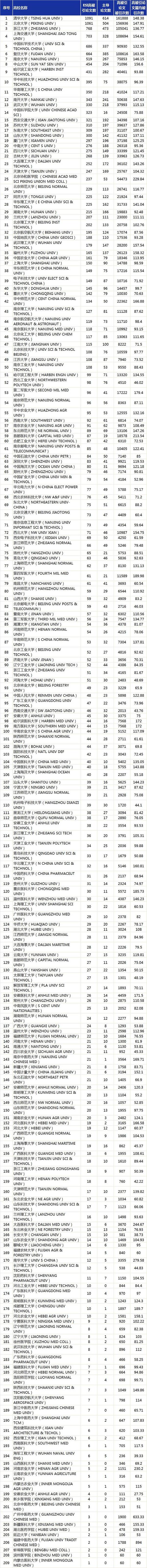 十年來高校被引論文數清北分列一、二名,總發文數量居首的浙大排名第三