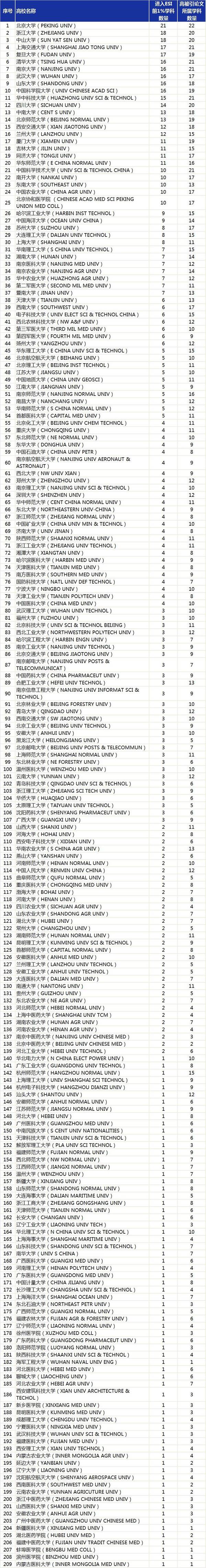 截至2017年2月28日,中國大陸共有209所高校至少有一個學科入選ESI前1%高被引學科。學科領域則將學科劃分為農業科學、生物學與生物化學、化學、臨床醫學、計算機科學、經濟學與商學、工程學、環境科學與生態學、地球科學、免疫學、材料科學、數學、微生物學、分子生物學與遺傳學、綜合交叉學科、神經系統學與行為學、藥理學和毒理學、物理學、植物學與動物學、精神病學與心理學、社會科學總論學科。