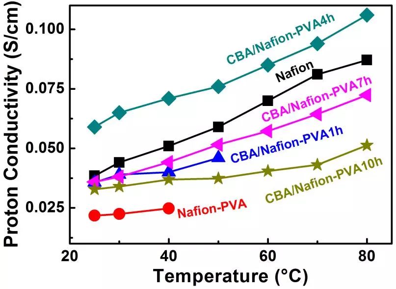 研究表明,自修復(fù)質(zhì)子交換膜中的PVA組分可以通過氫鍵相互作用交聯(lián)Nafion中的磺酸基團(tuán)從而形成比傳統(tǒng)的Nafion膜更小更密集的質(zhì)子傳輸通道。同時,該膜內(nèi)羥基和磺酸基團(tuán)之間形成的氫鍵網(wǎng)絡(luò)以及膜的高含水量也為質(zhì)子傳輸提供了連續(xù)的路徑。因此,該自修復(fù)質(zhì)子交換膜在80 °C的水中展現(xiàn)出較高的質(zhì)子傳導(dǎo)率(0.11 S/cm),這一數(shù)值比傳統(tǒng)的Nafion膜高出20%。