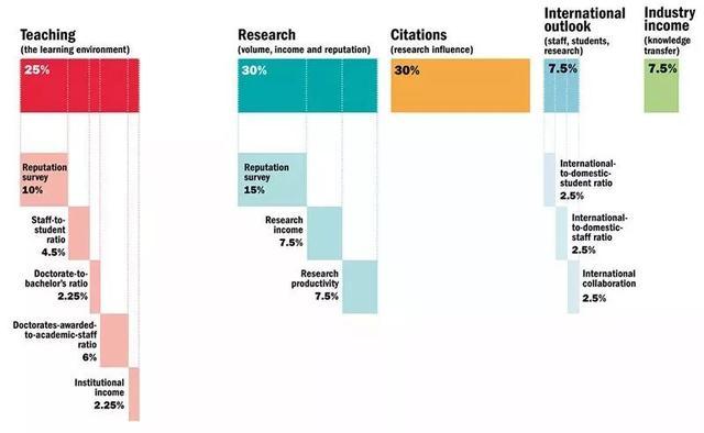 其中教學(xué)(Teaching)、科研(Research)和論文引用(Citations)分別占比25%、30%和30%,國際視野(International Outlook)占比7.5%,行業(yè)收入(Industry Income)占比7.5%。