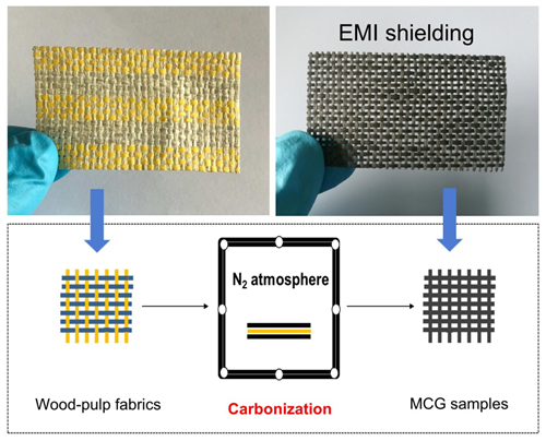 (2)生物質是一種環境友好的可持續和可再生資源,某些生物質通過碳化可以獲得具有理想電磁屏蔽性能的多孔碳材料,但直接使用原始生物質作為碳化前體可能會限制最終材料的結構多樣性。實際上,生物質材料可以加工成具有不同結構的各種生物基衍生物產品,并且它們可以適用于構建具有高性能的新型電磁屏蔽材料。研究人員簡單地通過木漿織物的碳化來制備高導電宏觀碳網格(MCG)材料(如圖2),所得到的樣品在厚度為~0.3mm左右不僅表現出優異的屏蔽效能(~20.3-45.5dB)(與其碳化溫度呈正相關或與其網格尺寸呈負相關),而且由于網格的存在,具有透光率在~15%-56%之間半透明特性。此外,雙層MCG材料可以在恒定厚度下通過微小平移運動改變網格的交錯度來方便地調節材料的屏蔽性能,對可調電磁波衰減器件的設計具有參考意義。相關結果發表于國際期刊Carbon, 2018, 139, 271-278。