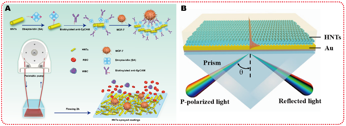 圖5埃洛石表面用于動態捕獲循環腫瘤細胞(A)和表面等離子體共振器件(B)的示意圖