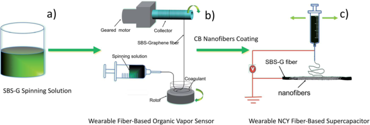 在該文中,作者從復(fù)合材料的可紡性、力學(xué)性能和功能性等角度考慮,采用聚(苯乙烯-丁二烯-苯乙烯)(poly(styrene-butadiene-styrene),SBS)作為柔性高聚物基材,以多層石墨烯(Few layer graphene,F(xiàn)LG)作為導(dǎo)電組分,通過(guò)濕法紡絲制備了一系列柔性SBS導(dǎo)電復(fù)合纖維,系統(tǒng)地研究了柔性SBS導(dǎo)電復(fù)合纖維結(jié)構(gòu)與傳感性能的內(nèi)在關(guān)系,實(shí)現(xiàn)了復(fù)合纖維高柔性和高性能的有機(jī)統(tǒng)一。此外,在柔性SBS導(dǎo)電復(fù)合纖維的基礎(chǔ)上,課題組通過(guò)靜電紡絲自組裝法,將電活性炭黑(Electroactive Carbon Black, CB)涂覆到SBS導(dǎo)電復(fù)合纖維的表面,從而制得了一系列自支撐的柔性一維紗線電極(Nanofibers Coated Yarns, NCY),并組裝成了全固態(tài)超級(jí)電容器,系統(tǒng)地研究了其電化學(xué)性能,實(shí)現(xiàn)了其在可穿戴儲(chǔ)能元件中的應(yīng)用。