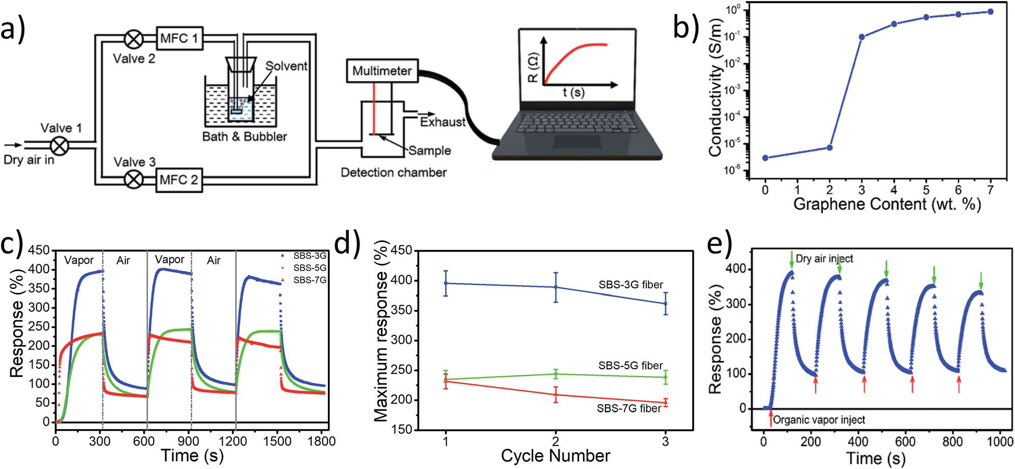 圖2 柔性SBS-G復(fù)合纖維對(duì)于不同溶劑蒸汽的傳感性能表征