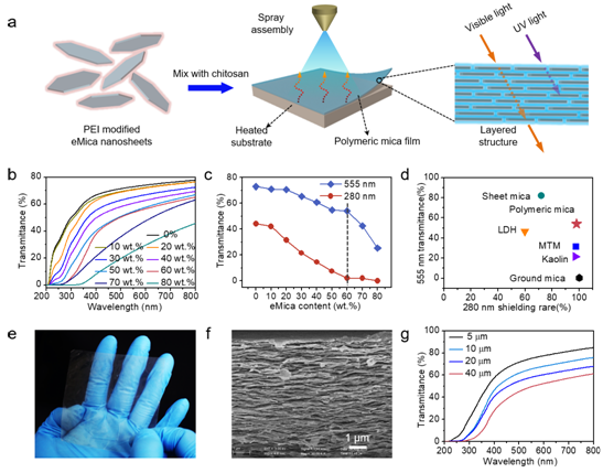 (a) 仿生云母膜制備的示意圖;(b) 不同比例的仿生云母膜的可見紫外透過率;(c-d) 仿生云母膜和其他仿貝殼粘土復合膜的可見光透過和紫外屏蔽性質(zhì)的對比;(e-f) 大尺寸的仿生云母膜的實物照片和微觀結構;(g) 不同厚度的仿生云母膜的可見紫外透過率。