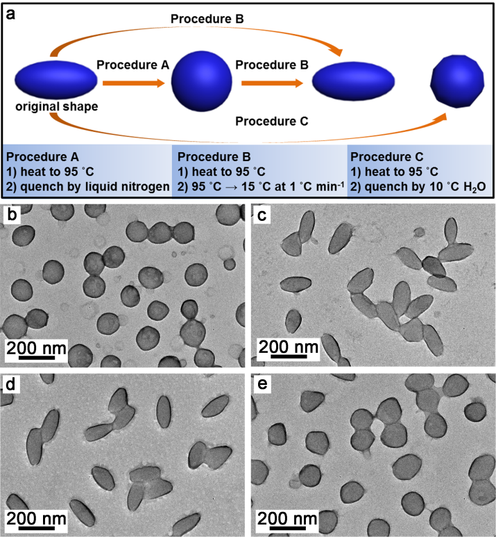 隨后,該團隊利用以上液晶組裝體的液晶-各向同性相相轉變,設計了不同的溫度程序,實現了組裝體橢球-球形的可控操縱。這一策略的基本原理是當溫度升高至液晶清亮點溫度以上時,液晶有序消失,組裝體在親溶劑鏈段的斥力作用下轉變為球形;當溫度降低至液晶清亮點溫度以下時,液晶有序結構重新形成,緩慢驅動液晶由球形至非球形轉變。在這個過程中,通過降溫速度的調控,可以實現對中間亞穩形貌的可控捕獲。程序A利用液氮淬冷,實現了橢球到球形組裝體的轉變;程序B以1℃/min的速度降溫,因而橢球形組裝體可以實現形貌的回復;對程序A作用后的組裝體再施以程序B,可以實現球形粒子到橢球的轉變。此外,當利用水冷自然降溫時,組裝體的形成產生了一定程度的動力學凍結,得到了帶棱的球形粒子。
