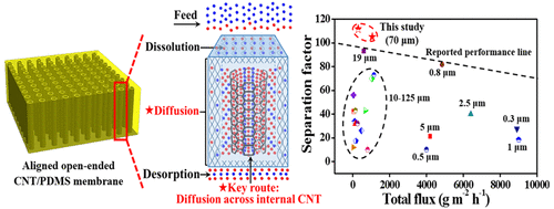 由于石油資源逐漸枯竭和大氣污染日益嚴重,乙醇和丁醇作為代表性的生物燃料受到強烈關注。目前生物法生產生物醇面臨的主要問題是微生物對產物的脅迫耐受性差,導致產物濃度低,下游產品分離能耗高等突出問題。由于滲透汽化具有分離效率高、能耗低、無污染等優點,被認為是最有前途的分離技術,但是當前滲透汽化膜存在滲透性和選擇性之間不可兼得的問題。目前研究最多的滲透汽化膜材料為聚二甲基硅氧烷(PDMS),模擬結果表明小分子在PDMS中的擴散屬于“空穴跳躍擴散理論”,即擴散并非是連續的,而是原地的小幅震動與大幅的跳躍相結合,使其擴散速率較低。碳納米管(CNT)內外壁非常光滑,摩擦力小,有利于分子的快速傳輸,可作為理想的膜填充材料。但是傳統的共混制備法,使得CNT在膜中無規聚集,無法有效控制和進一步提高CNT膜的結構和性能。通過計算機模擬,研究者們發現垂直排列的CNT具有許多獨特的優勢,如單分散的納米孔道、水分子可快速通過等,使其在膜分離領域具有潛在應用。