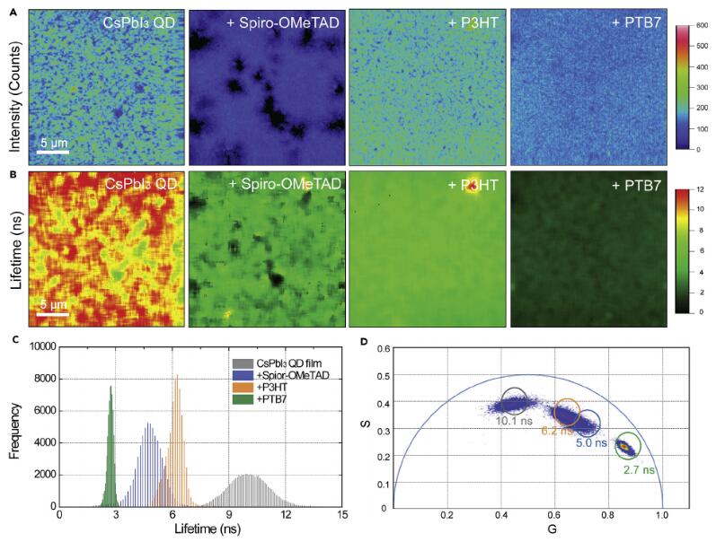 本研究中首次利用時間分辨熒光共焦成像系統在20μm x 20μm的維度上研究CsPbI3量子點/空穴傳輸層的界面,當量子點薄膜覆蓋聚合物層后熒光強度和熒光壽命均明顯下降,說明電荷的有效提取,值得注意的是,CsPbI3量子點單層膜的平均壽命10.1 ns且分布較寬,當覆蓋聚合物P3HT和PTB7后壽命明顯降低,且分布更窄,衰減途徑減少(矢量圖圓圈右移),說明CsPbI3量子點薄膜中的缺陷態被聚合物鈍化,由于PTB7與CsPbI3量子點薄膜具有更加匹配的能級位置,優異的成膜質量和傳輸特性,因此獲得了最優的器件性能。