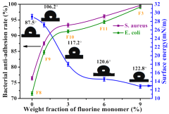 圖5不同含氟量的抗菌織物的抗菌防黏附率,水接觸角,表面能