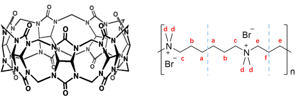 圖2. (a) 0 mM的聚凝胺在用0, 0.5, 1.5當量的CB[7] 滴定時的1H NMR圖。(b) HB@CB[7]形成準輪烷的示意圖. (c) 等溫滴定量熱法熱譜圖(上),滴定過程中的焓變曲線圖(下)。