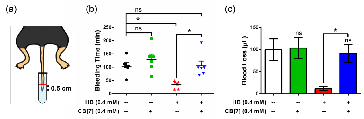 該團隊首先利用核磁等檢測手段驗證聚凝胺的己基鏈完全包含在CB[7]的腔內,形成準輪烷(如圖2所示);其次利用ITC(等溫滴定量熱法)測定CB[7]與聚凝胺的結合常數和結合比率,發現CB[7]與聚凝胺有著高達(1.04 ± 0.19)×107 M-1的結合強度,且聚凝胺重復單元與CB[7]的結合比例為1:1。進一步的研究表明,在紅細胞實驗和小鼠割尾出血這兩種體外模型上,CB[7]可以顯著減輕聚陽離子引起的凝血癥狀(圖3)。在聚凝胺的急毒性實驗中,展示了靜脈注射聚凝胺會引起小鼠肺栓塞死亡,CB[7]的存在大大減輕了這一癥狀,且高劑量的CB[7]并未引起抗凝血副作用,印證了CB[7]在血液循環體系的生物相容性。該工作首次報道了CB[7] 可潛在的逆轉或者中和臨床上使用的肝素中和劑。