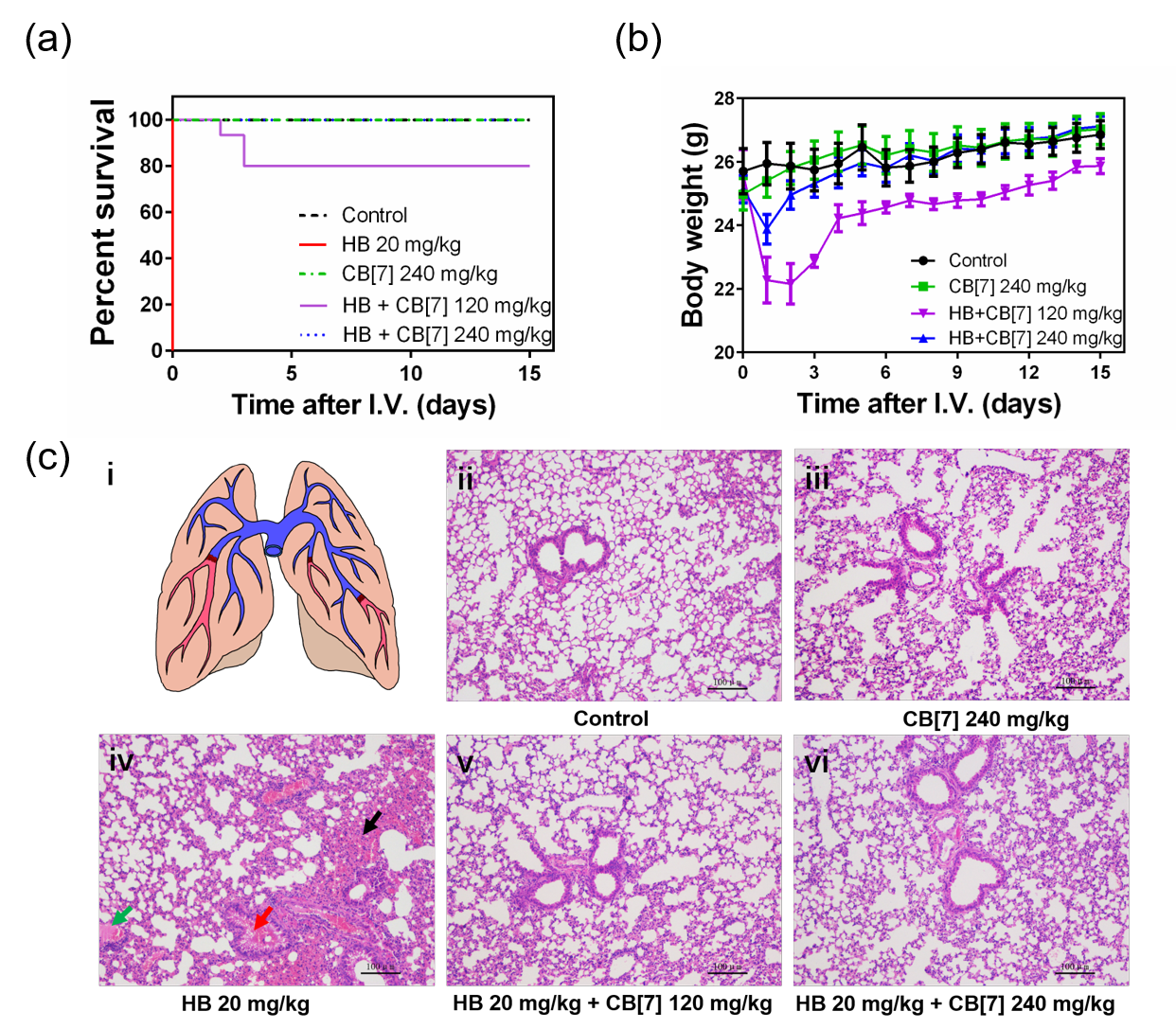 圖4. (a) 小鼠尾靜脈注射聚凝胺及聚凝胺和CB[7]復合物后的生存曲線圖。(b) 小鼠尾靜脈注射聚凝胺及聚凝胺和CB[7]復合物后的體重圖。(c) 肺部栓塞示意圖(i) 和小鼠肺部H&E切片(ii-vi)。