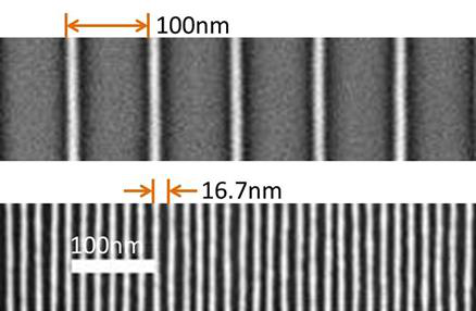 圖2上圖是EUV光刻膠模板線寬尺寸的SEM圖,下圖為經(jīng)過三嵌段共聚物導(dǎo)向自組裝后的特征尺寸圖案。