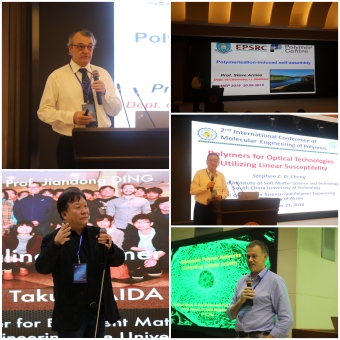 復旦大學楊玉良院士、香港科技大學唐本忠院士、中科院化學所劉云圻院士、復旦大學江明院士分別主持了大會報告。會議特邀的4位大會報告人分別是:(1)日本東京大學的杰出教授Takuzo Aida (相田卓三),高分子和超分子新材料和新興物質科學領域十分有感染力和創造力的學者,他作了題為“Non-equilibrated supramolecular chemistry and materials science”的大會報告;(2)英國皇家學院院士、謝菲爾德大學的Steven P. Armes教授,他是國際高分子化學方面的名家,作了題為“Polymerization-induced self-assembly”的大會報告;(3)美國工程院院士、阿克隆大學Stephen Z. D. Cheng(程正迪)教授,作了題為“Polymers for optical technologies utilizing linear susceptibility”的大會報告;(4)澳大利亞AIBN生物工程和納米技術研究所所長、澳大利亞昆士蘭大學Alan Rowan教授,他在仿細胞骨架纖維非線性力學行為的合成高分子方面有獨到研究,作了題為“Biomimetic polymer networks a key to controlling Cell Fate”的大會報告。