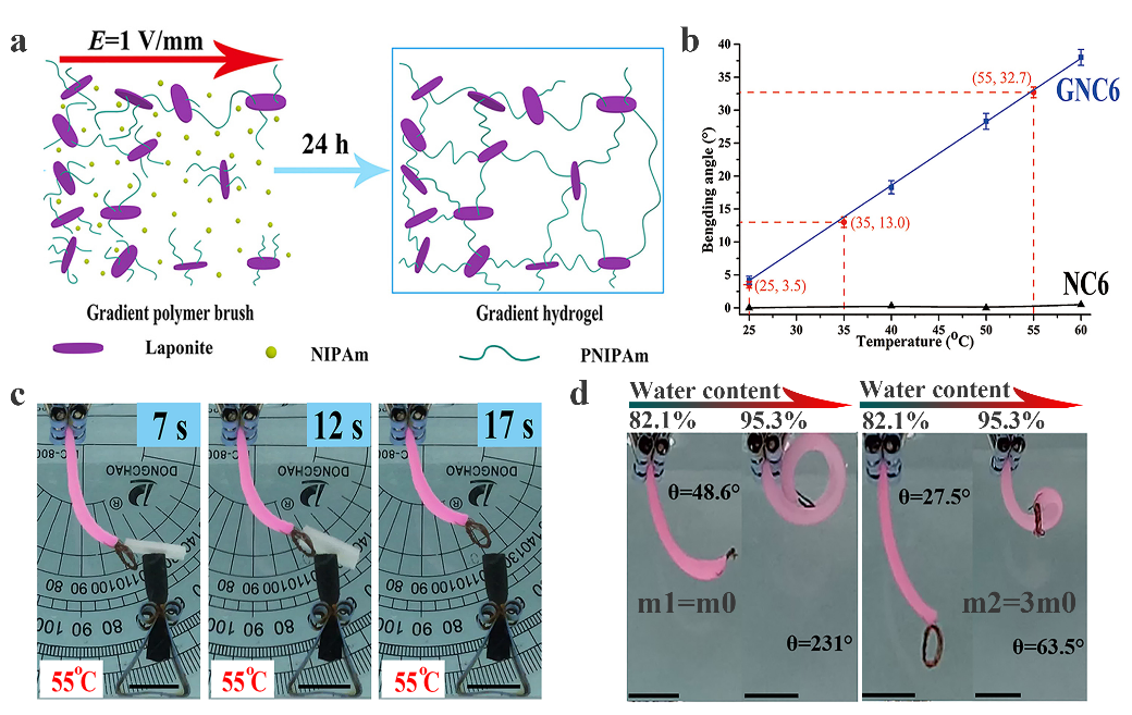 受自然界天然高強材料與智能材料中梯度結構的啟發,四川大學徐世美教授研究小組基于鋰藻土(Laponite)的帶電膠體性質以及交聯作用,利用電場誘導Laponite梯度分布和N-異丙基丙烯酰胺(NIPAM)原位自由基聚合制備了具有連續梯度結構的納米復合溫敏性水凝膠驅動器PNIPAM/Laponite,該驅動器具有良好的力學性能和快速的彎曲響應性能。此外還表現出有趣的水促響應行為,即在一定范圍內提高水含量,可大大提高響應速度和變形程度(Macromol. Rapid Commun. 2018, 1700863)。然而在該結構凝膠中,由于回復過程依然基于凝膠再溶脹吸水原理,因此導致回復速度較慢且仍需在水環境中進行。