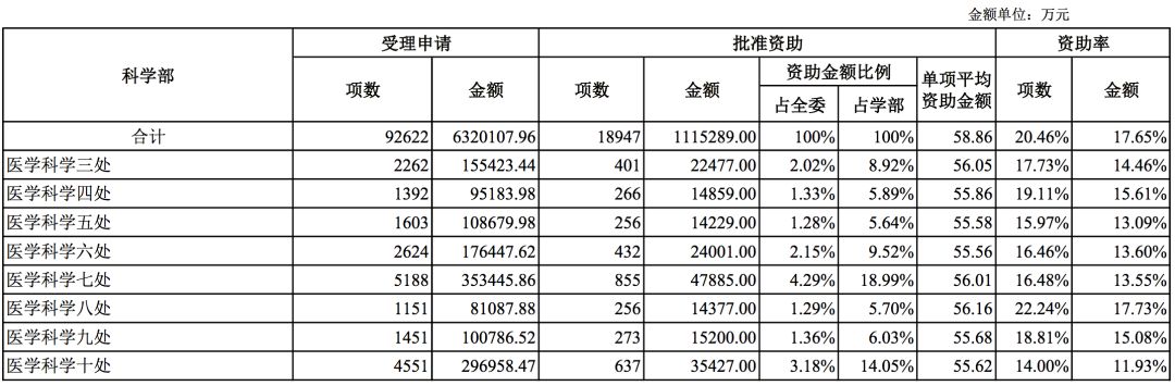 2018年,國家基金委共受理申請面上項目92622項,涉及總金額6320107.96萬元。經(jīng)過評審,基金委共資助面上項目18947項,總金額1115289.00萬元。從項目數(shù)來看,資助率為20.46%。申請與資助情況按學科領域統(tǒng)計如下: