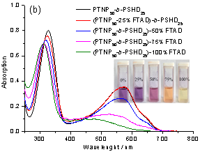 圖3. 無規共聚物(a)和嵌段共聚物(b)修飾前后的紫外-可見吸收光譜