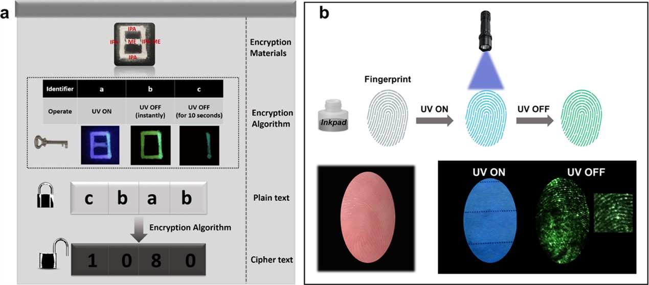 近期,北京師范大學化學學院閆東鵬教授課題組借鑒無機長余輝體系設計中基于熱激發能量傳遞的思路,提出了利用熱活化延遲熒光(TADF)輔助F?rster共振能量轉移(FRET)實現超長有機RTP的機理。為了證實該機理,首先選擇了能級匹配和取向適合的有機分子,其中熱活化延遲熒光分子三聚氰胺(ME)作為能量給體(donor),磷光分子鄰苯二甲酸(PA)、間苯二甲酸(IPA)和對苯二甲酸(TPA)作為能量受體(acceptor),據此建立了三個氫鍵組裝共晶模型體系(PA-ME,IPA-ME,TPA-ME)。通過穩態/瞬態光譜技術,發現相比于前驅體,三種共晶材料的RTP壽命大大提高,其中IPA-ME的磷光壽命可達2 s,高于目前報道的大多數純有機長余輝材料。實驗結果證明,磷光壽命的提高是依靠熱活化延遲熒光分子ME到受體的有效能量轉移(效率高達76%),證實了TADF和FRET協同作用下實現超長室溫磷光的設想,也為構筑純有機長余輝材料提供了新的策略。此外,利用磷光時間分辨的特點,進一步發展了該類材料在信息加密和指紋識別領域中的應用。