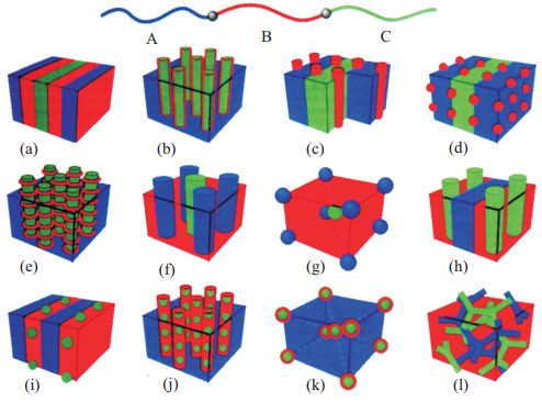 理論計算預測的ABC三嵌段共聚物的微相分離結構,不同顏色代表不同聚合物組分