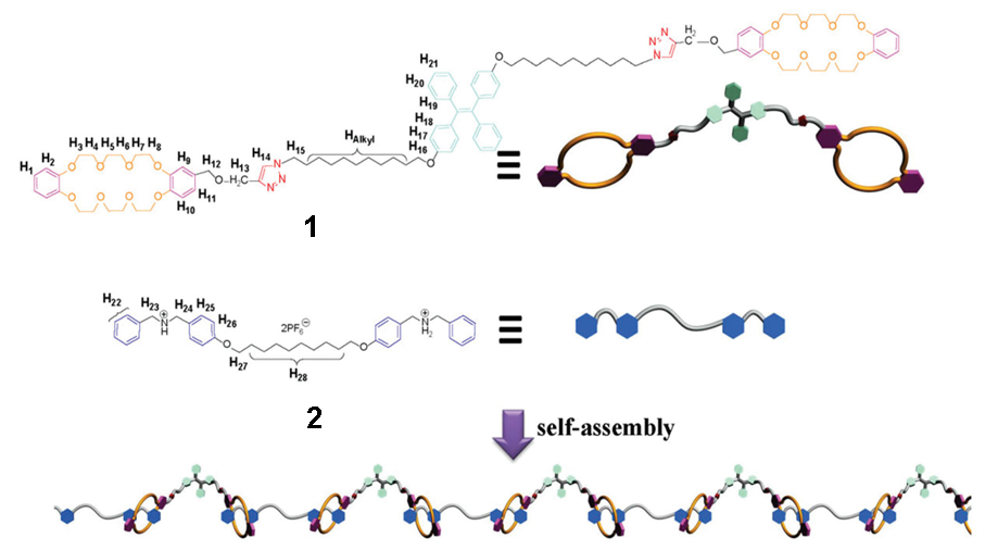 圖2 帶有冠醚和TPE基團的單體1和雙二級銨鹽2通過主客體相互作用形成線性超分子聚合物。